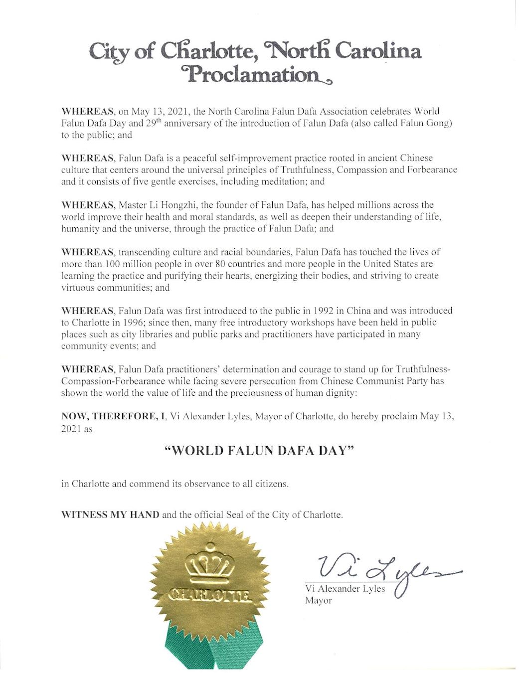 在美国北卡州夏洛特市(Charlotte),市长亚历山大·莱尔斯(Vi Alexander Lyles)宣布二零二一年五月十三日为“法轮大法日”,以表彰真、善、忍对提升人类道德和身心健康的贡献。
