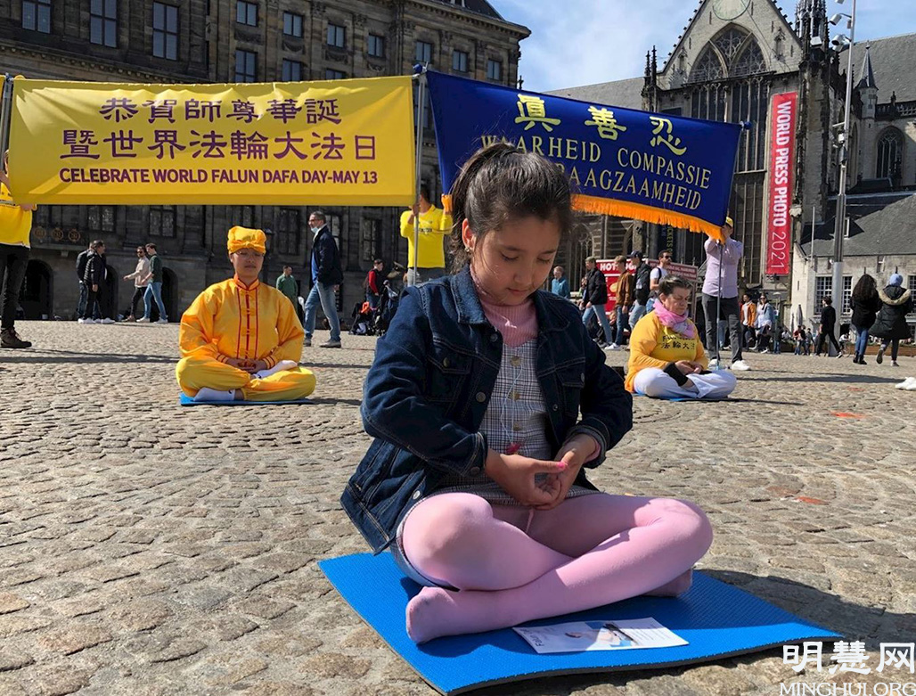 荷兰法轮功学员身着黄色炼功服,进行了功法演示,吸引了很多民众。一位土耳其小女孩很感兴趣,在现场停留了很久,一起学炼,很快就学会了,打坐有模有样,十分可爱。