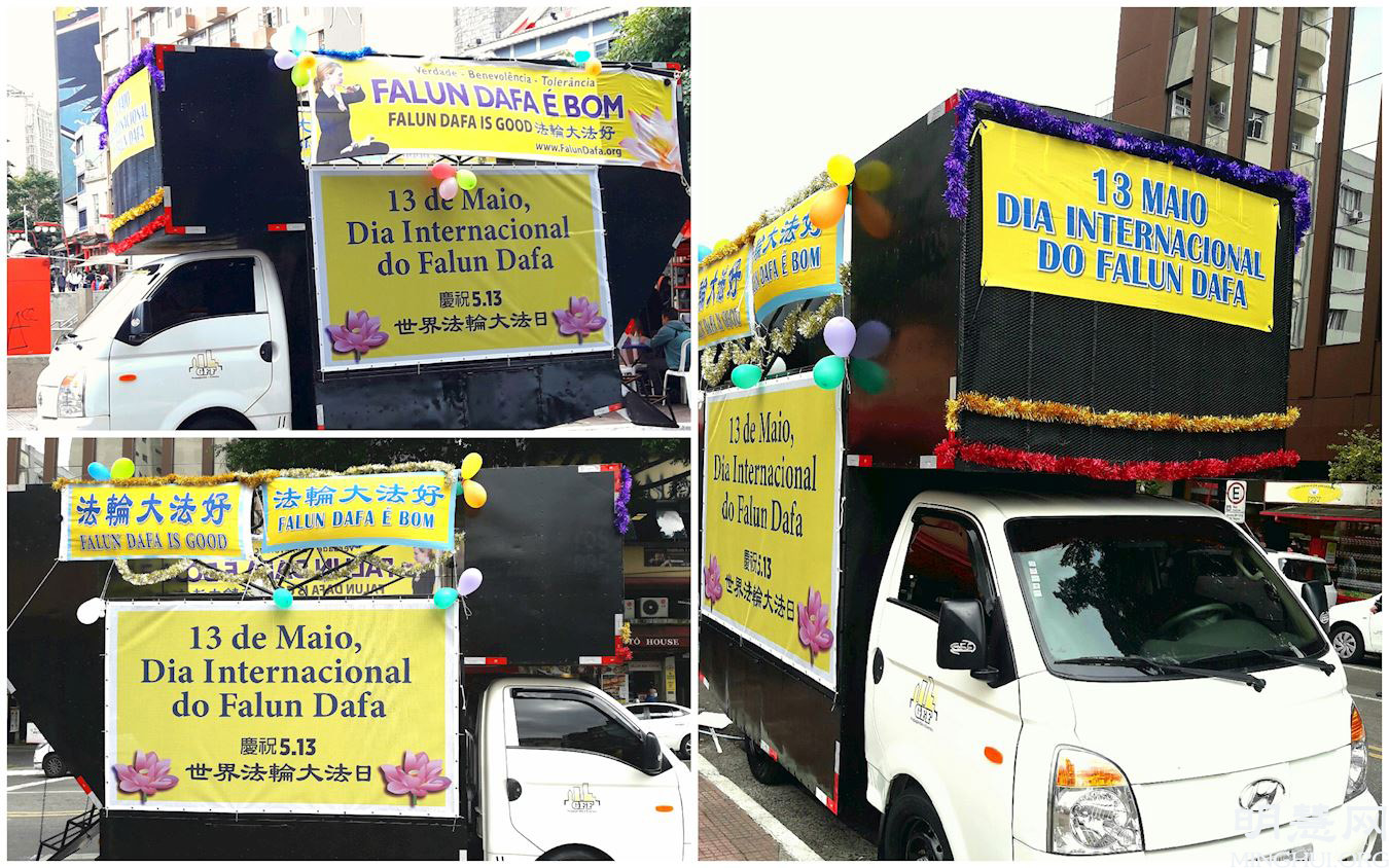 游行花车分别用中文和葡文向民众们介绍“五·一三”世界法轮大法日和法轮功,学员们在花车附近发法轮功真相资料。