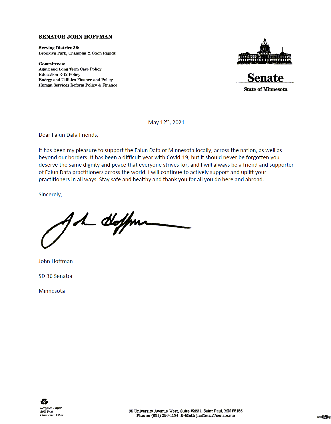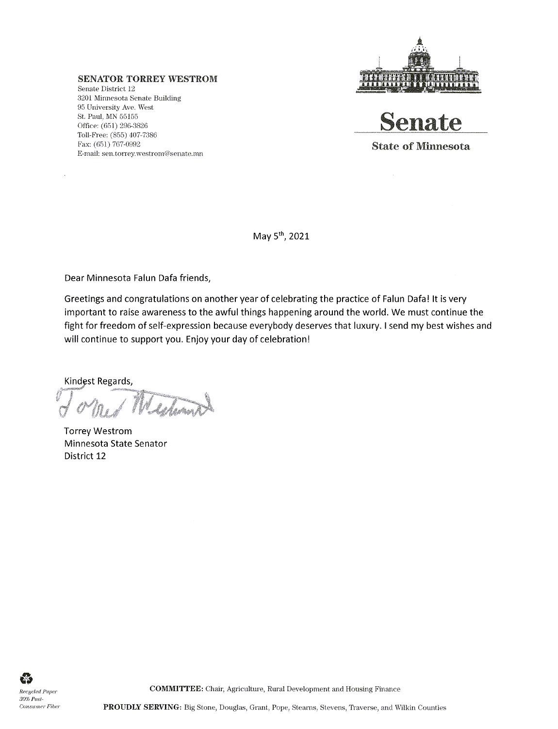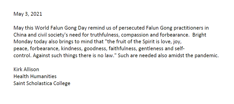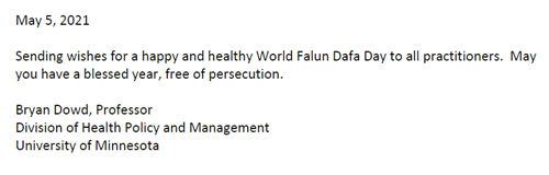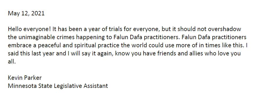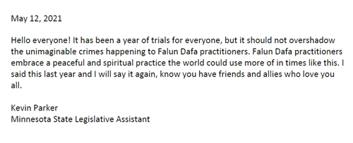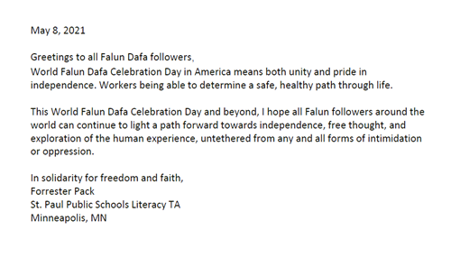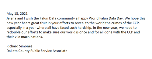 我很高兴能在当地、全国以及境外支持明尼苏达州的法轮大法。这一年,大流行病的日子很不好过,但我们永远不应该忘记,你们应该得到每个人都在努力争取的尊严和和平。我将永远是全世界法轮大法学员的朋友和支持者。我将继续以各种方式积极支持你们的修炼。保持安全和健康,感谢你们在这里和国外所做的一切。