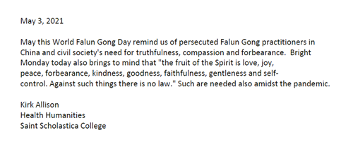 在这个“世界法轮大法日”及以后的日子里,我希望世界各地的法轮大法弟子能够继续照亮一条通往独立、自由思想和探索人类经验的道路,不受任何和所有形式的恐吓或压迫的束缚。