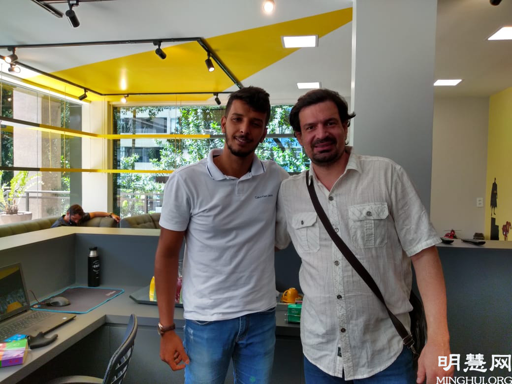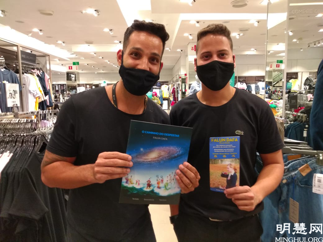 ![]() 图4:年轻经理Riachuelo服装店经理厚给(Roque)(左)认真听完真相后说:“同化真善忍,提高人们道德太重要了,我非常赞成。” |