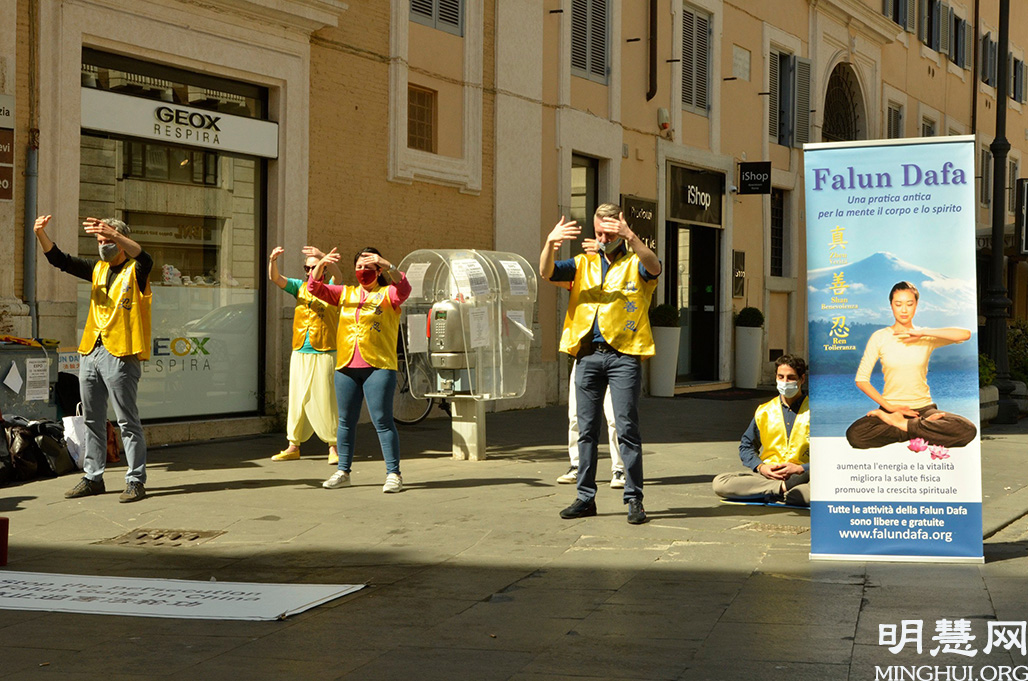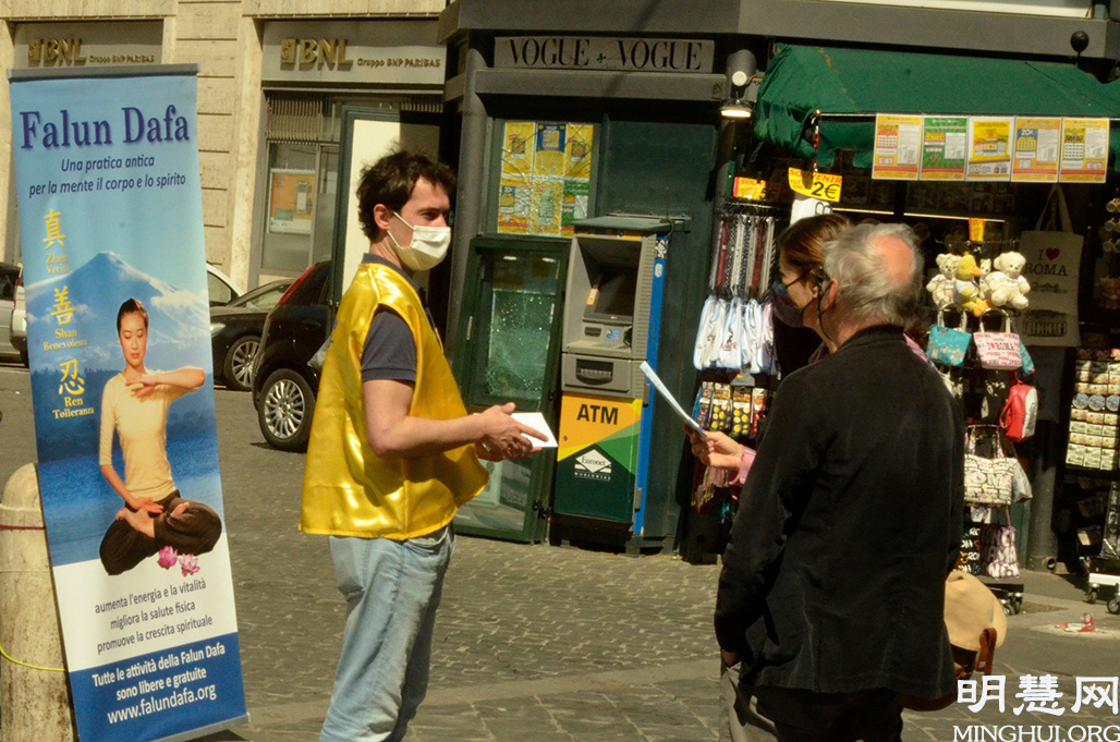 五月九日的罗马阳光灿烂,疫情有所缓解,人们逐渐走到室外,享受五月地中海特有的阳光,温暖舒适,洋溢着春天的气息。法轮功学员布置好展板后,有的学员集体炼功,有的则向过往的行人发放资料,讲真相。人们在得知真相后,有些人表示愿意提供帮助,并表示他们将在网上请愿书上签名,反对活摘器官。