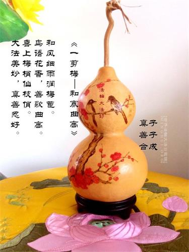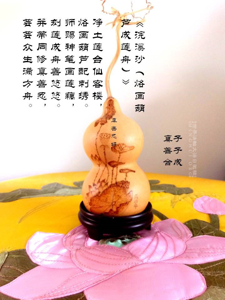净土莲台仙客楼,烙画葫芦配刺绣。师赐神笔画莲藕,刻莲成舟善悠悠。并蒂同修真善忍,芸芸众生满方舟。