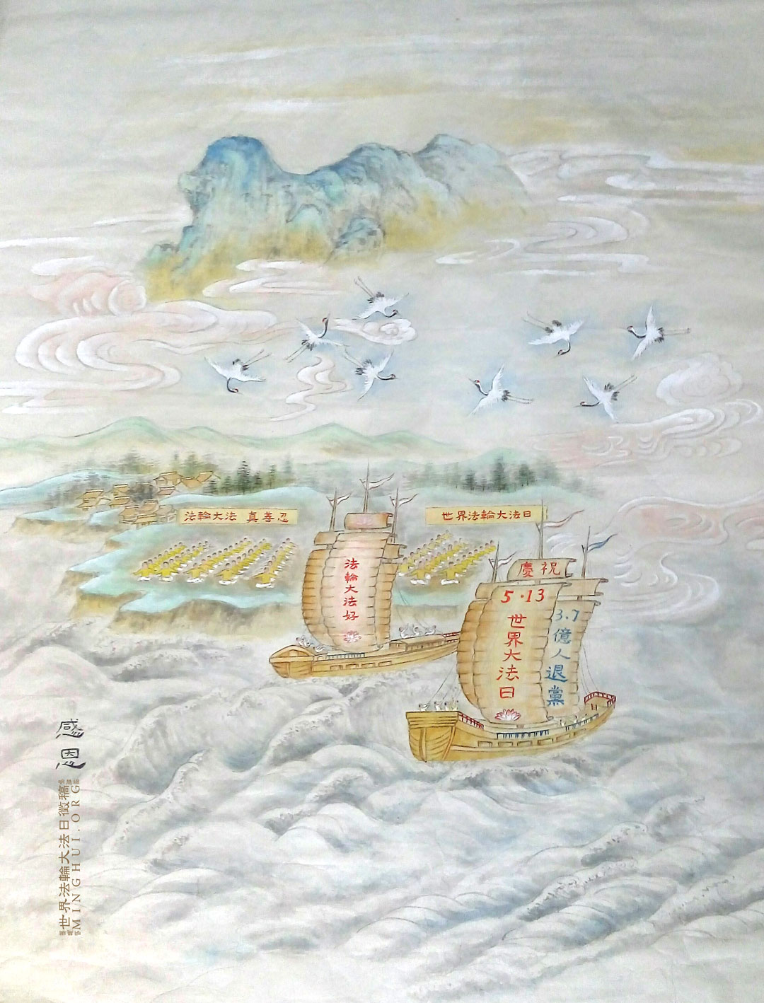 尺寸: 65×75厘米说明:绘画的背景是代表香港精神的塞拉利昂,以此比喻大法弟子不畏苦难、勇猛精进真修的状态。本地有一位同修在师尊的加持下,用慈悲及纯正的心态共劝退了五十七万多人次。借此机会感恩师尊的慈悲救度。