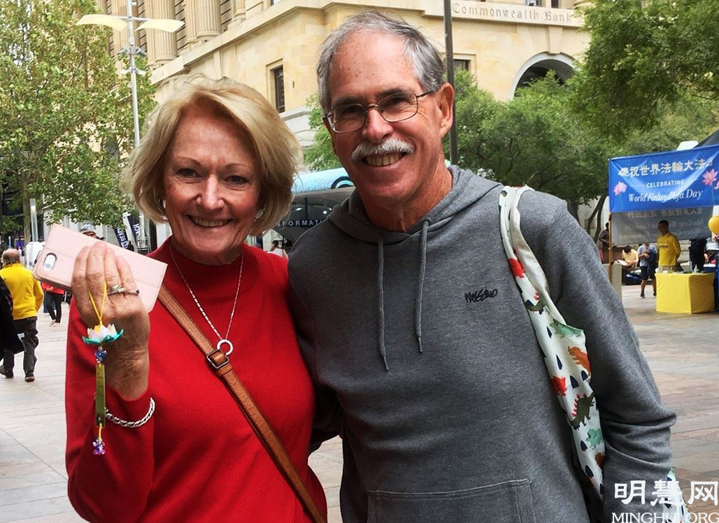 家住悉尼的马丁夫妇驻足观赏游行,布雷·马丁(Brett Martin)觉得这个表演很特别,他高兴的说:“整个游行队伍者脸上总是充满着微笑,打鼓的声音听起来轻快有力,感觉功法对健康很好。”他接着说“我知道法轮功在中国被迫害的事,这很不可思议,法轮功是一个很平和的组织。我得知罗利山(Mount Lawley)有一个炼功点,将推荐我们住在西澳的儿子到那学功。”