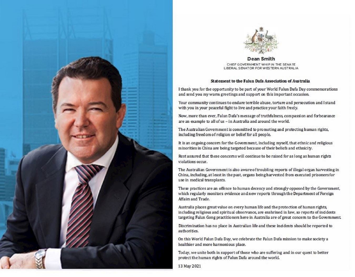 西澳自由党联邦参议员迪恩·史密斯(Senator Dean Smith)先生为庆典活动发贺信,表达他对法轮功团体的祝福和支持。他在贺信中说:“澳洲政府致力于促进和保护人权,包括人民的宗教自由。”