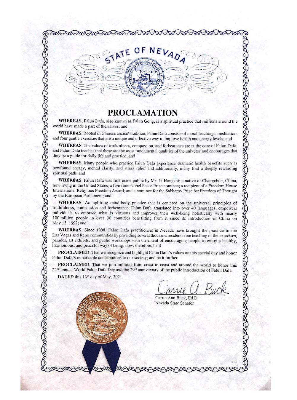 【明慧网二零二一年五月二日】(明慧记者王英编译报道)二零二一年五月十三日是第二十九届世界法轮大法日,在此之际,美国内华达州参议员凯莉·安·巴克签发褒奖令,表达对法轮大法创始人和修炼者的感谢,褒奖法轮大法对社会做出的杰出贡献,并褒奖世界法轮大法日。