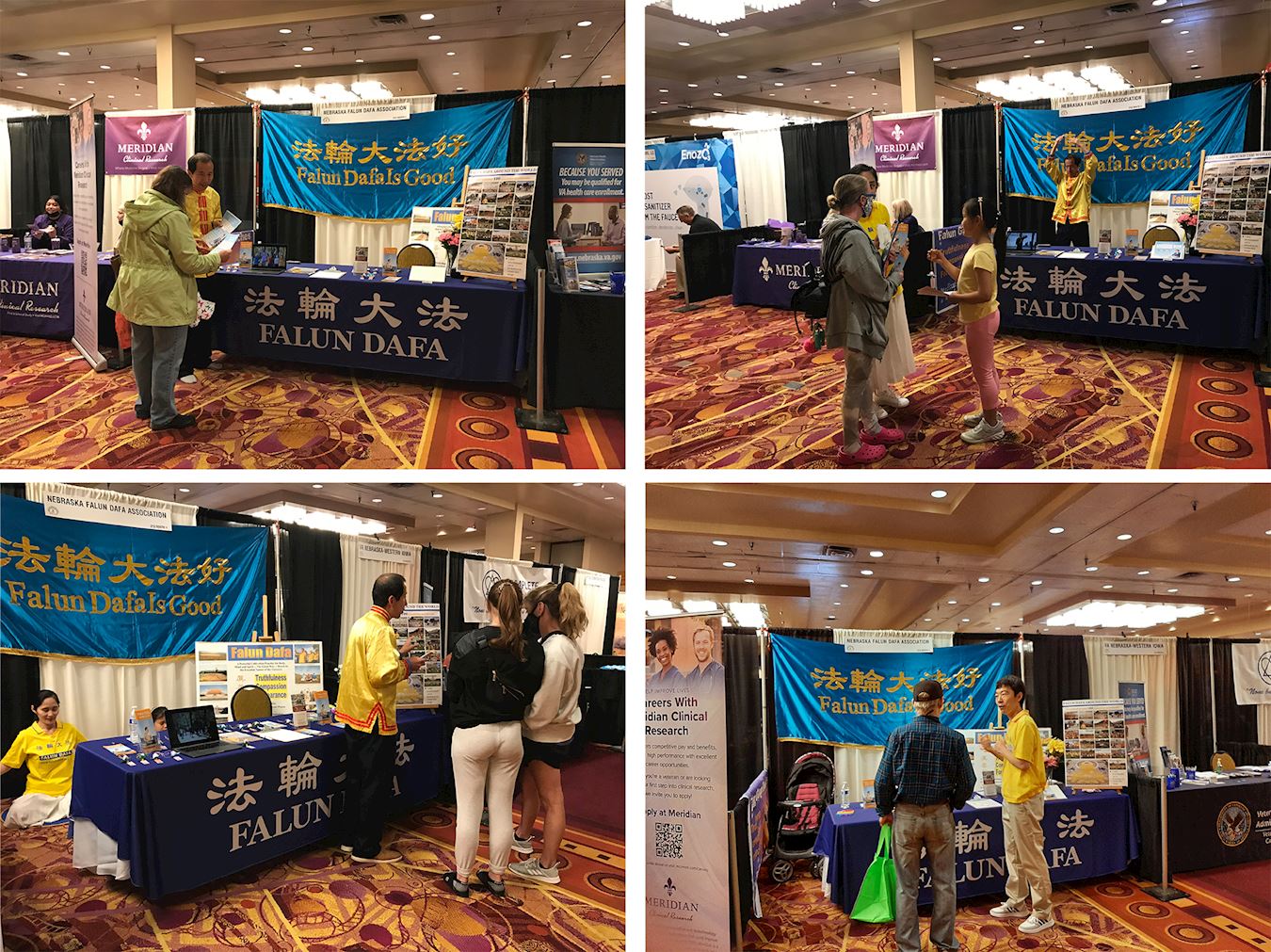 内布拉斯加州法轮功学员再次参加健康展,与当地民众分享来自中国传统的修炼功法——法轮大法。学员们在展位上演示五套功法,向人们介绍法轮大法祛病健身的神奇功效。有人当场学炼功法,更多的人希望参加每周末在公园的集体炼功。
