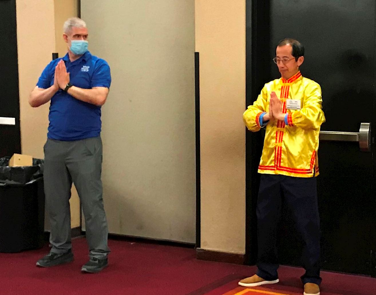 凯夫先生(Mr. Cav)是隔壁展位退伍军人医疗部门(VA Nebraska-Western Iowa Health Care System)教授太极的老师,他一看到介绍法轮功的展位,马上表露出浓厚兴趣,过来询问什么是法轮功。学员黄先生给他介绍功法原理。凯夫因为练太极,很赞同身心合一,认为心灵的清净也能使人体整个体系也得到净化,免疫力提升,他表示很想学炼功法。在之后人流不多时,他跟黄先生学炼了功法,并留下自己的联系方式,希望之后有机会与当地学员一起炼功。