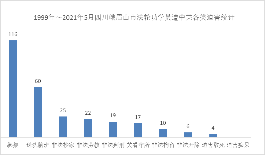 ![]() 图:一九九九年七月~二零二一年五月二十日峨眉山市法轮功学员遭中共各类迫害统计 |