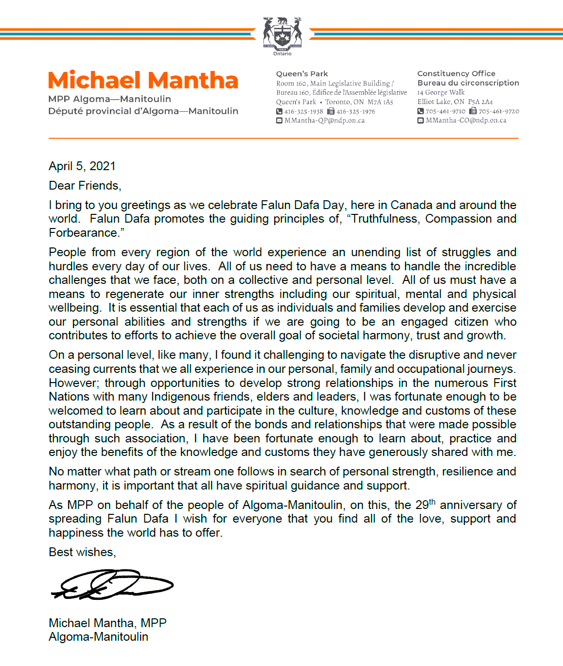作为阿尔戈马-马尼图林(Algoma-Manitoulin)人民的省议会代表,在此纪念法轮大法弘传29周年之际,我希望每个人都能在这个世界上找到爱、支撑和幸福。
