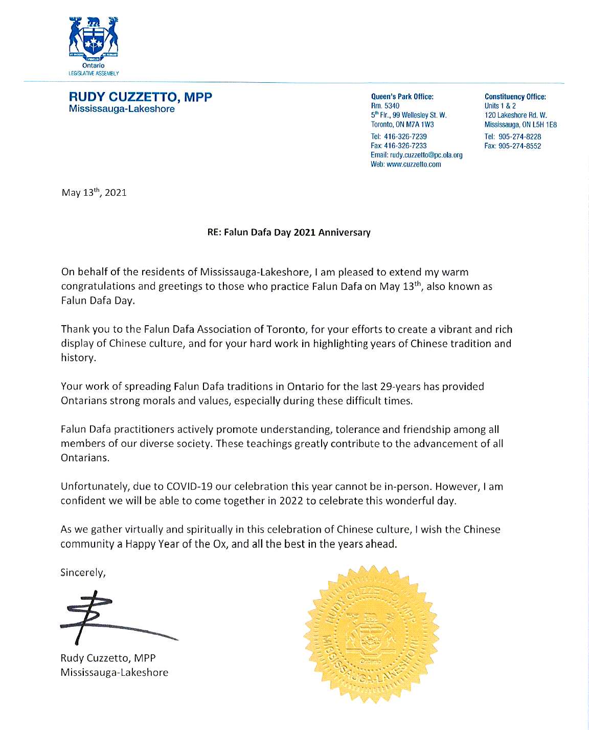 图3:安省密西沙加-湖岸区(Mississauga-Lakeshore)省议员鲁迪·库泽托 (Rudy Cuzzetto)的贺信。