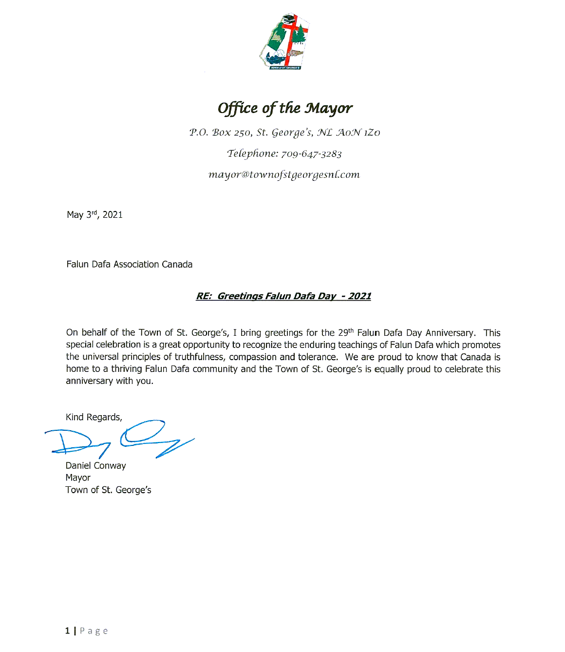 '图4:纽芬兰与拉布拉多省的圣乔治斯市(Town of St. George’s)丹尼尔·康威市长(Daniel Conway)的贺信。'