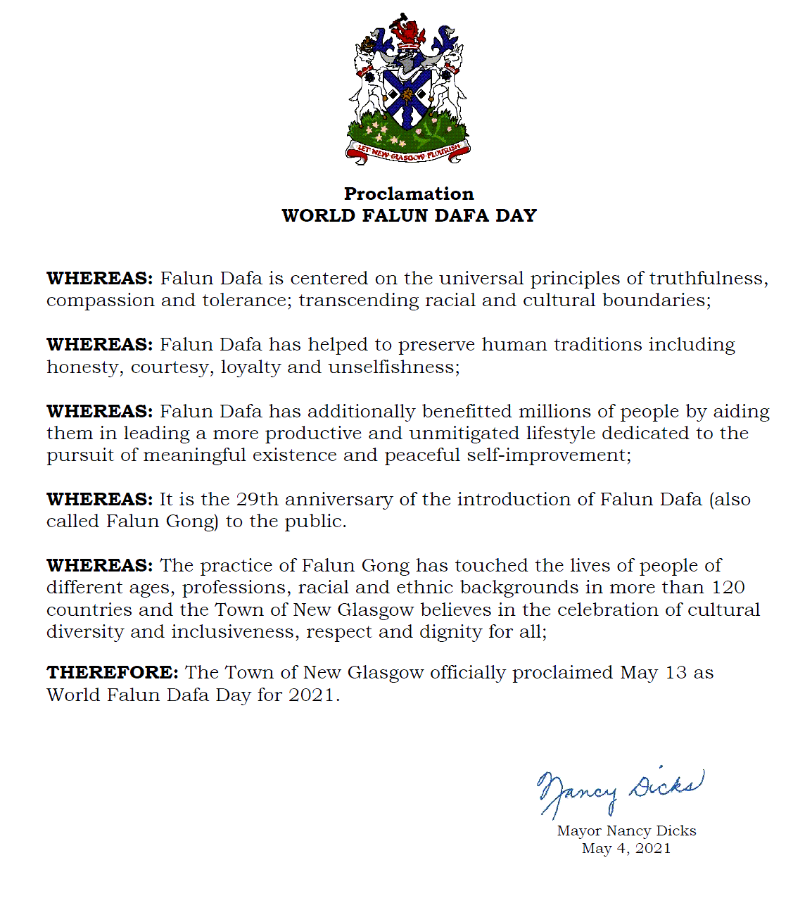 因此,新格拉斯哥镇正式宣布5月13日为2021年世界法轮大法日。