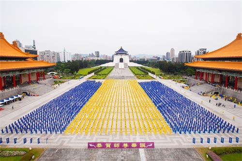 ![]() 图2~3:二零二一年五月一日,五千二百多名台湾法轮功学员集聚台北中正纪念堂前自由广场排字,并恭祝伟大的师尊生日快乐。 |