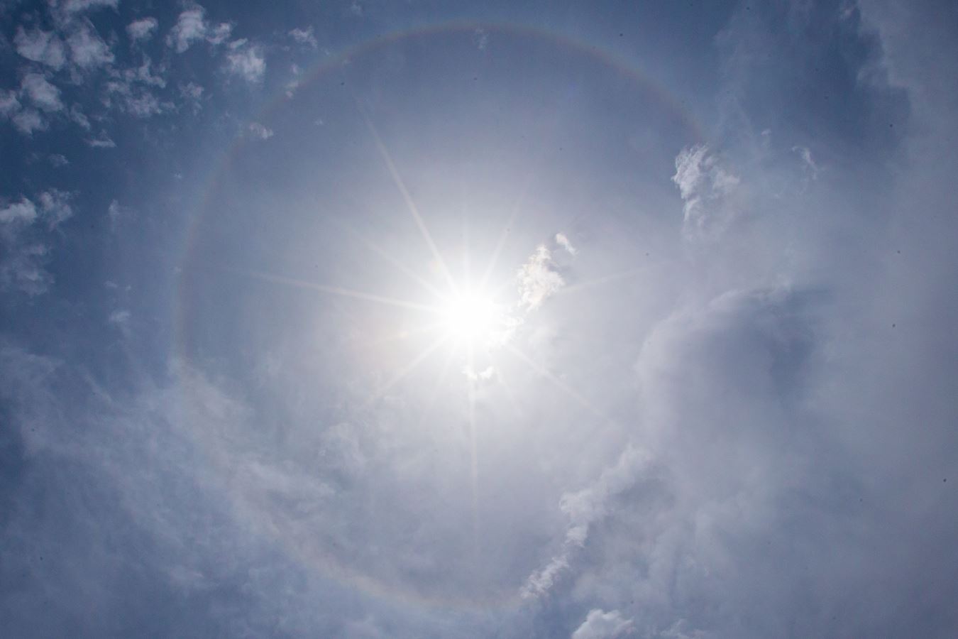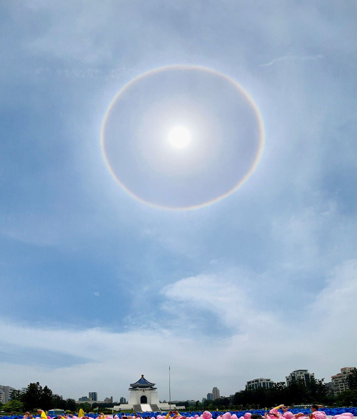 台北这几天下雨,但五月一日阳光普照,一大早,自由广场已涌入数千名法轮功学员,井然有序,九点半开始入场,首先完成两颗寿桃,紧接着“贺师尊华诞暨法轮大法洪传29周年”依序完成,这时一阵清凉微风而过,天空突然出现太阳外圈环绕彩虹光圈的七彩日晕奇景,现场民众齐喊“好神奇”。