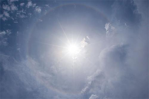 ![]() 图4~5:法轮功学员拍摄排字当天上空七彩日晕上龙飞舞而过奇景。 |