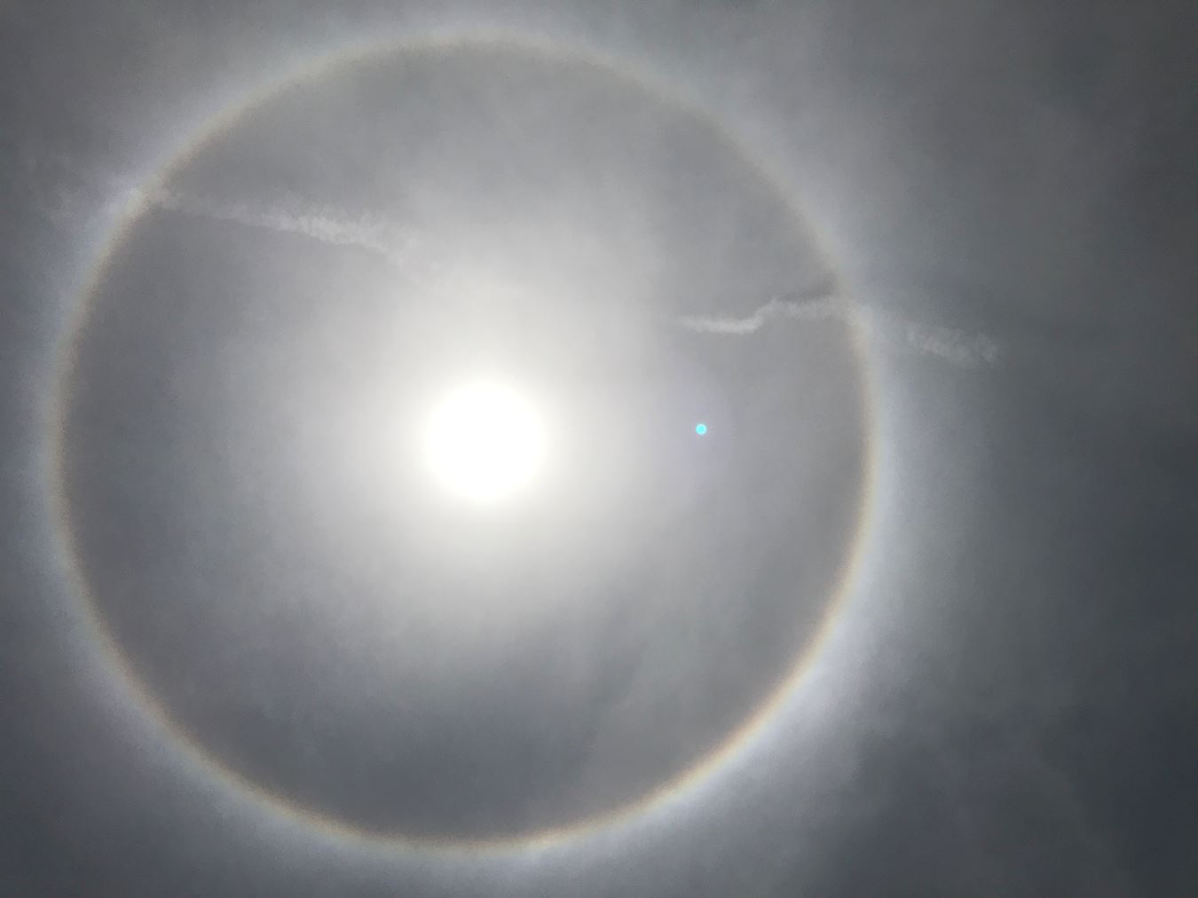 邱姓学员说,他看到“创世主乘龙而来,日呈七彩祥瑞”。彩虹日晕正中间的太阳显为法轮图形发出金色光辉,外层金莲层层交叠,金莲的层数多到难以数尽。