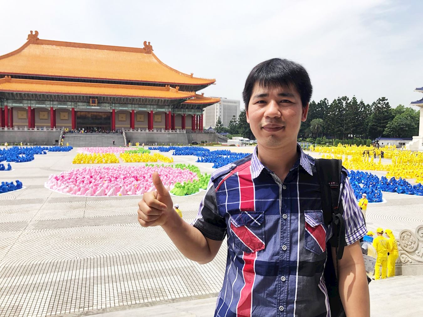 越南籍电脑工程师阮春享陪同修炼法轮功的妻子到自由广场参与排字活动。阮先生表示,妻子学炼法轮功一年多,看得出来变不一样了,“她不会生气、也不会计较。以前就很好,现在更好了。”他腼腆地说自己越来越爱妻子。
