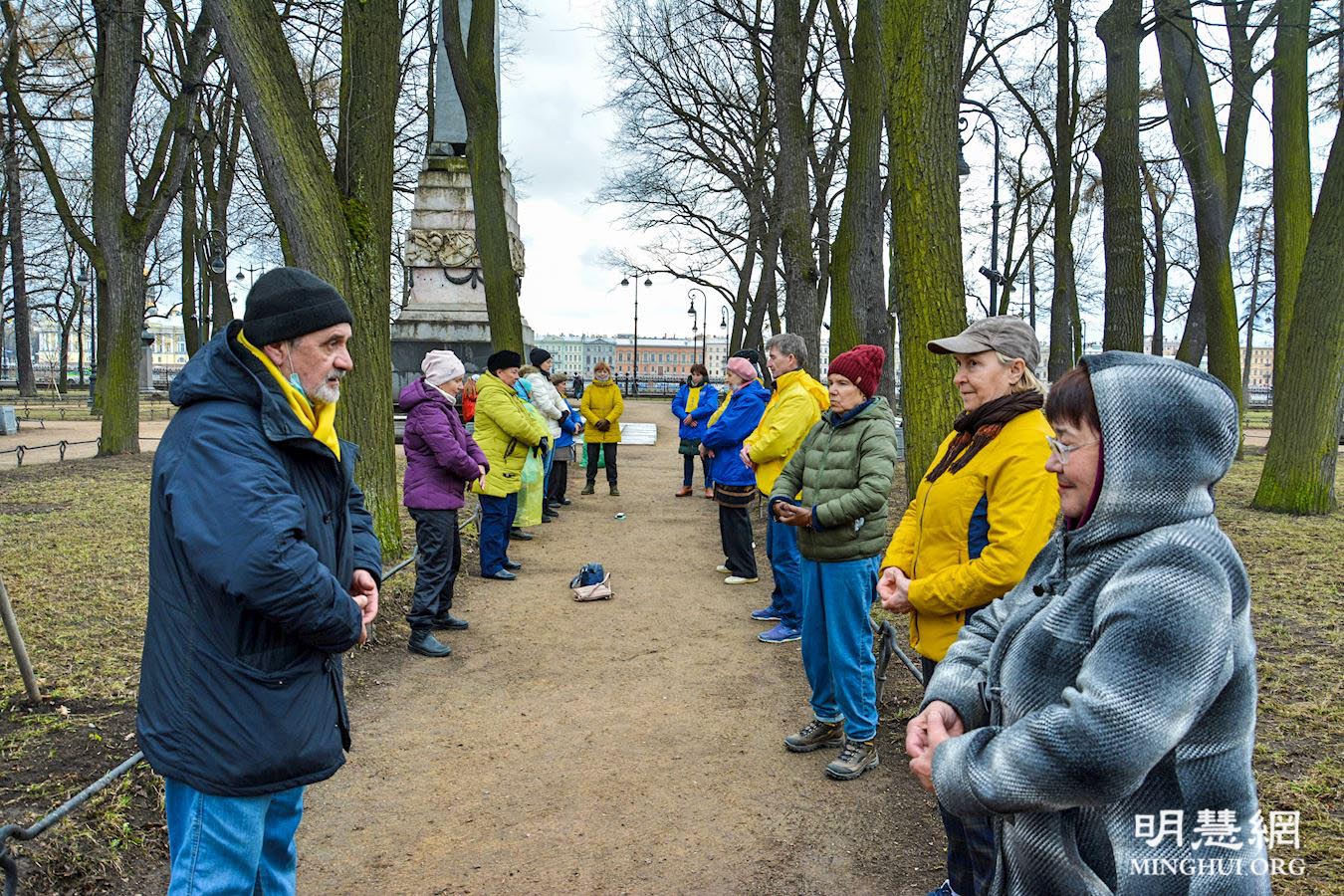 【明慧网二零二一年五月六日】四月最后一个星期六是“世界太极拳和气功日”。二零二一年四月二十四日是圣彼得堡市第五次庆祝这个日子,一些希望通过各种东方保健方法增强自己健康的人参加了活动。为了向当地民众介绍法轮功,法轮功学员也参加了这个活动。不少人现场学功。