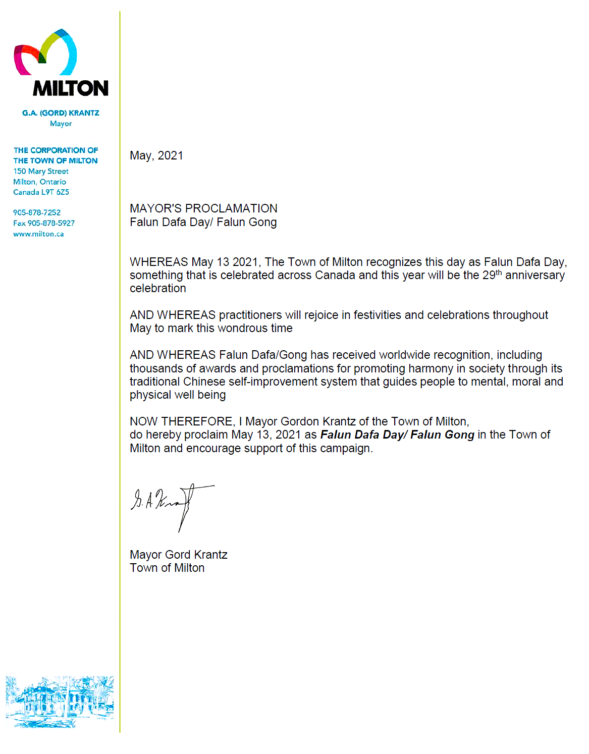 今年市长戈登‧克兰茨(Gordon Krantz)又为法轮大法日发出褒奖:米尔顿市宣布2021年5月13日为“法轮大法日”——一个在加拿大各地都被庆祝的节日;在五月,法轮功修炼者们将欢庆这一不寻常的节日;法轮功通过中国传统的完善、提高自我的修炼方法,使人们获得了心灵、道德以及身体的健康,促进社区和谐。法轮功在世界范围内得到了认可,并获得成千上万的褒奖。