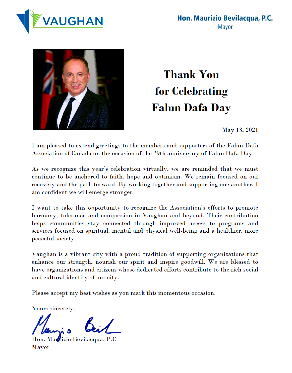 安省大多伦多地区旺市(Vaughan)市长毛里齐奥·贝维拉瓜(Maurizio Bevilacqua)发出贺信称:我非常高兴能在法轮大法洪传29周年之际,向加拿大法轮大法学会的成员们和支持者表达我的问候。
