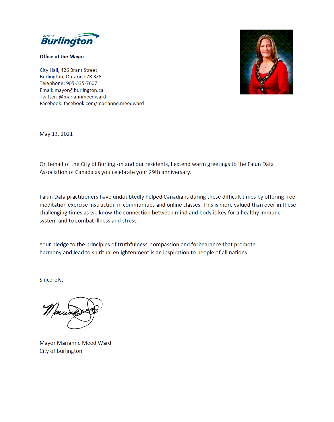 安省伯灵顿市(Burlington)市长玛丽安娜‧米德‧沃德(Marianne Meed Ward)发出贺信:代表本市居民,向法轮大法日送上诚挚问候。