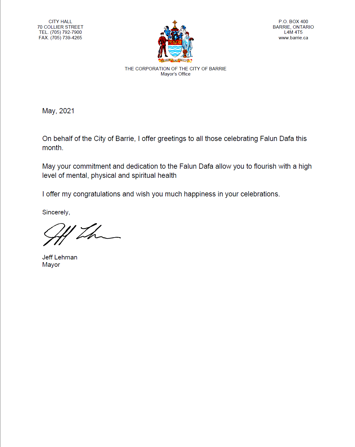 安省巴里市(Barrie)市长杰夫·雷曼(Jeff Lehman)的贺信:我代表巴里市向祝贺法轮大法日的所有人表示问候。愿你们对法轮大法的坚守和实践为你们带来身心灵的不断提升。祝贺庆典成功。