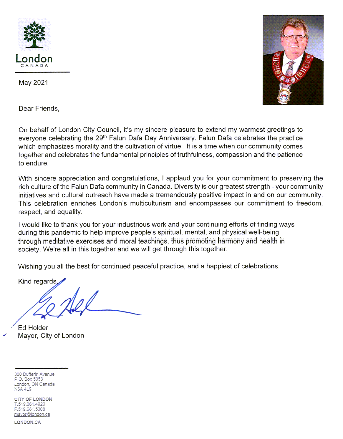 心怀由衷的热情与自豪,我为你们在加拿大保护及传承法轮大法的丰富文化而喝彩。多元是我们最大的优势。(法轮大法的)活动与文化推广对我们的社区产生了巨大的正面影响。这次庆祝活动丰富了伦敦市的多元文化,并凸显了我们对自由、尊重、平等的弘扬。