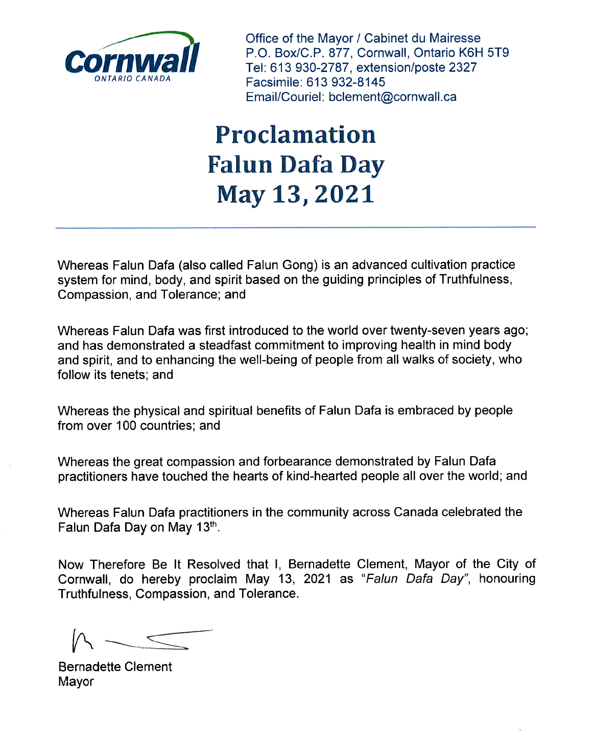 鉴于全加拿大的法轮大法修炼者普天同庆5月13日的法轮大法日,现兹决议,我本人,Bernadette Clement,作为康沃尔市市长,正式宣布2021年5月13日为“法轮大法日”,褒奖“真、善、忍”。
