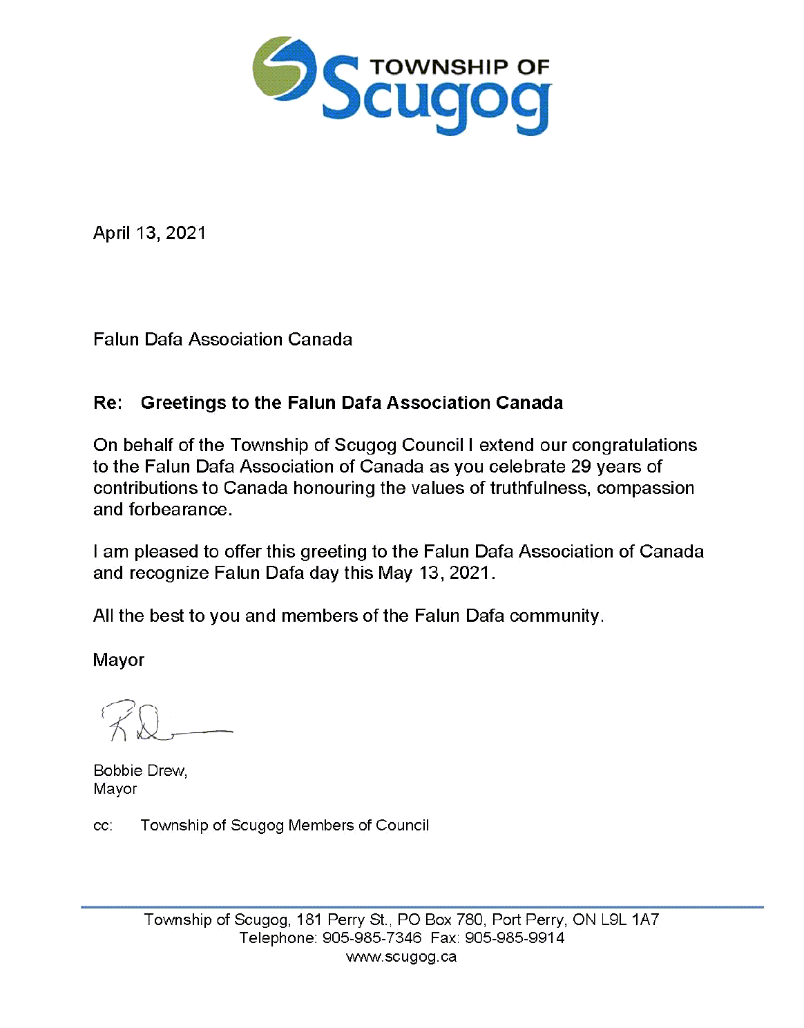 安省施古克镇(Scugog)镇长鲍比·德鲁(Bobbie Drew)的贺信:我代表市议会,向29年来致力于弘扬真善忍价值,奉献加拿大社会的法轮大法协会致以问候。在2021年5月13日之际,向法轮大法协会以及法轮大法成员送上最美好的祝愿。