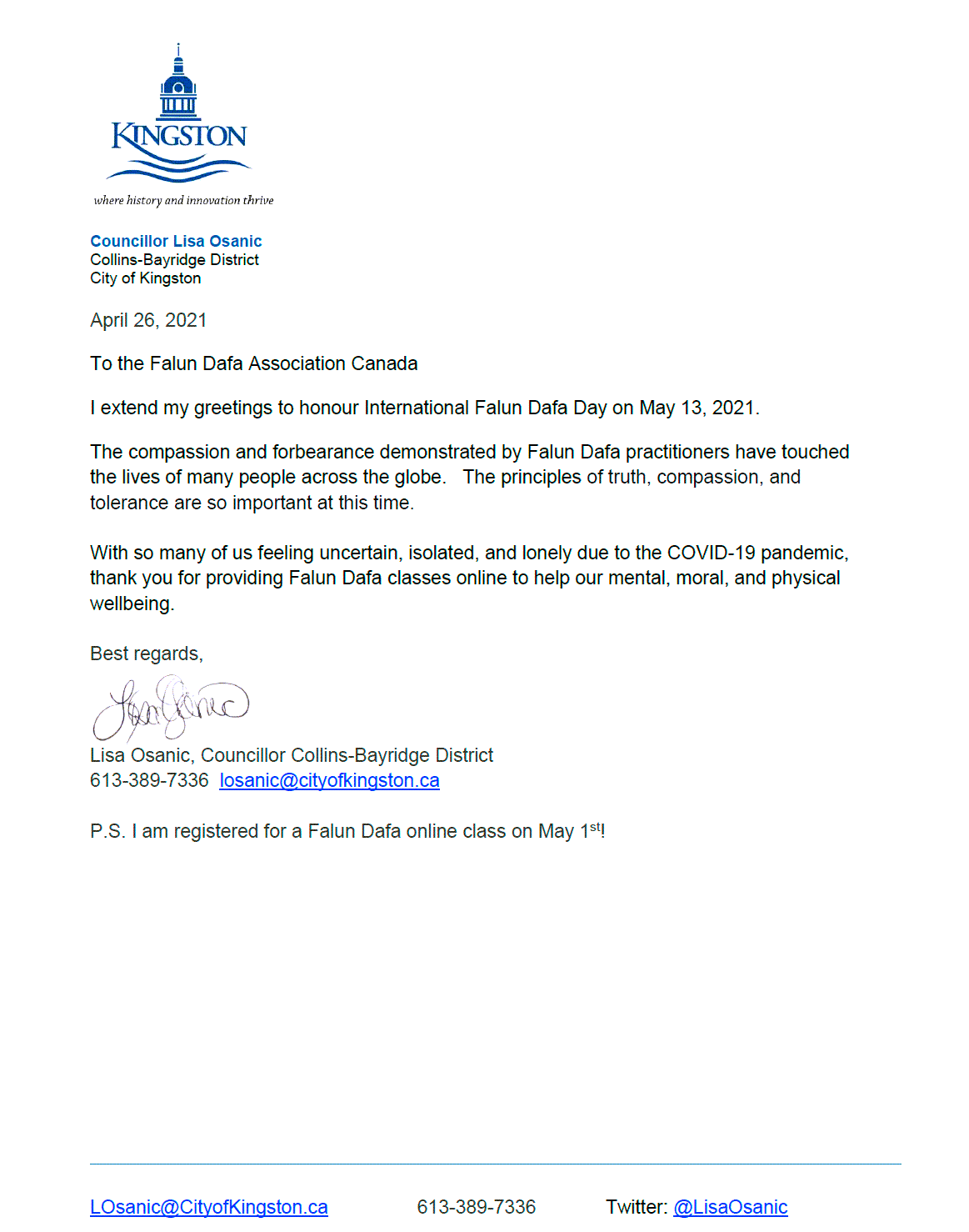 安省金斯顿市(Kingston)市议员丽莎·奥萨尼奇(Lisa Osanic)的贺信写着:我向2021年5月13日世界法轮大法日致以问候。