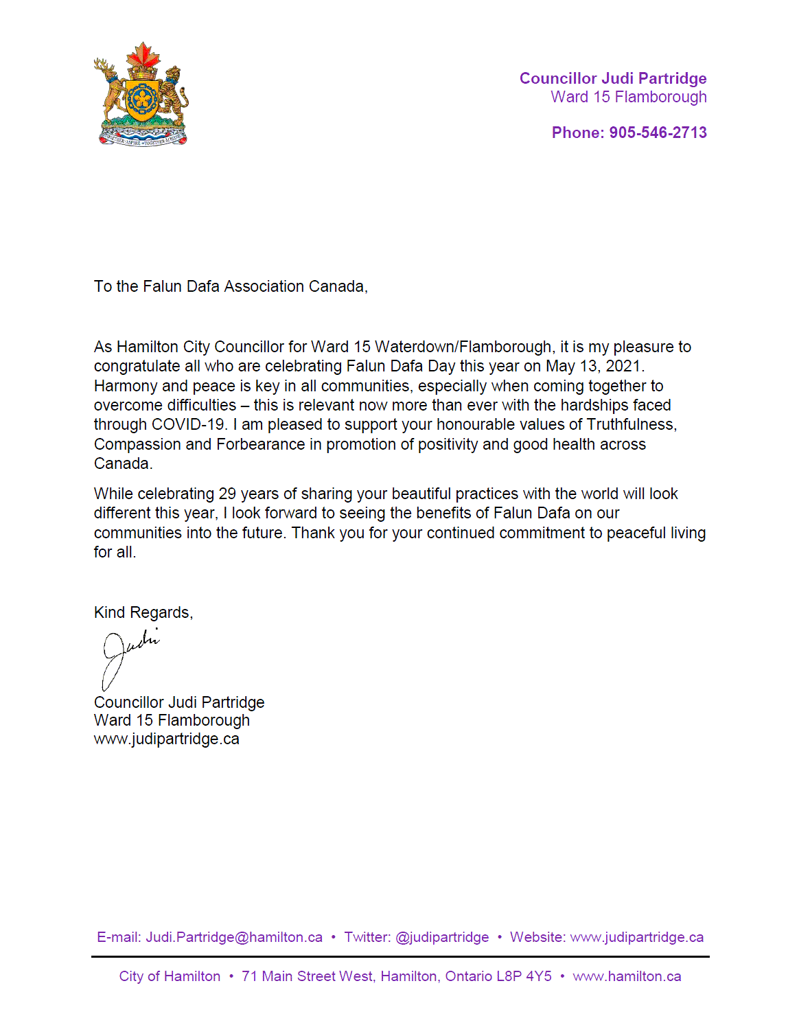 安省汉密尔顿市(Hamilton)市议员朱迪·帕特里奇(Judi Partridge)来信写道:向所有参与2021年5.13法轮大法日庆典的朋友们送上问候。和谐和平对所有的社区都至关重要,尤其是在共同抵抗疫情的此时此刻。我支持真善忍的高尚信仰,在加拿大各个社区中弘扬健康和积极向上的心态。