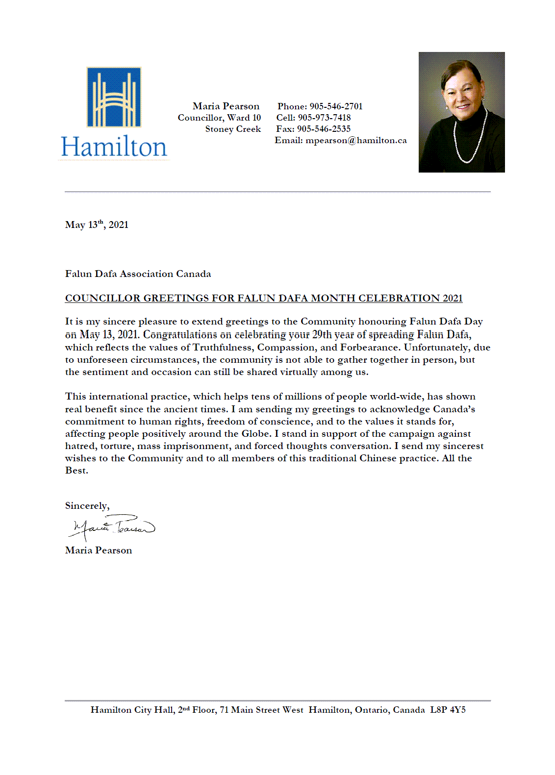 安省汉密尔顿市议员玛丽亚·皮尔森(Maria Pearson)向庆贺2021年5月13日法轮大法日的社区致以最诚挚的问候。祝贺信仰真善忍价值观的法轮大法传世29周年。虽然不能欢聚一堂,你们依然可以通过网络分享庆典的喜悦。