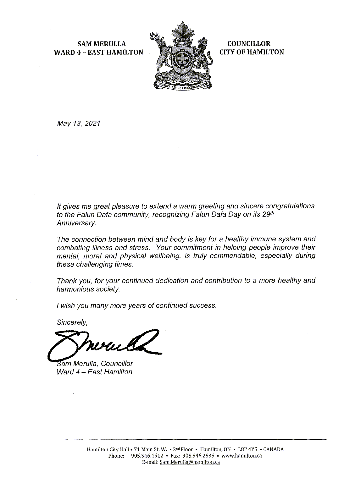 安省汉密尔顿市议员山姆·梅鲁拉(Sam Merulla)在贺信里说:值此法轮大法洪传29年之际,我在此非常高兴的向法轮大法社区致以热烈和诚挚的祝贺!