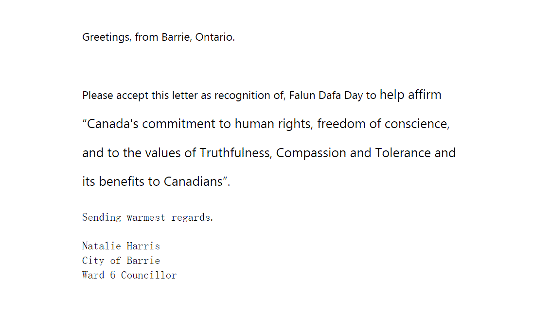 安省巴里市(Barrie)议员纳塔利·哈里斯(Natalie Harris)说以此信认可法轮大法日,重申加拿大对人权和信仰自由的承诺,认可真善忍价值观对加拿大人的益处。