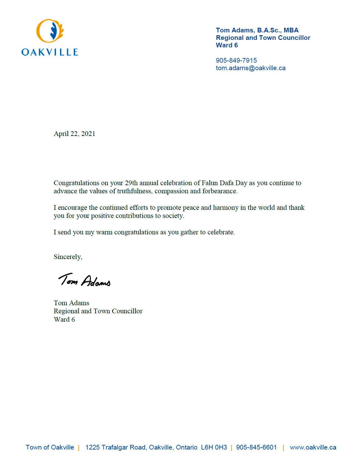安省奥克维尔市(Oakville)市议员汤姆·亚当斯(Tom Adams)贺信写道:祝贺你们庆祝法轮大法29周年,继续弘扬真善忍的价值观。我鼓励你们持续努力促进世界和平与和谐,并感谢你们为社会做出的积极贡献。在你们欢聚之时,我向你们致以热烈的祝贺。