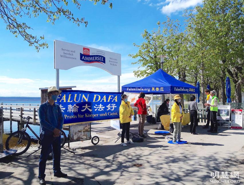 四月三十日,法轮功学员来到阿莫湖畔的赫尔兴(Herrsching am Ammersee)举办活动。当天天气非常好,散步的人很多,很多人观看法轮功学员展示功法,观看展板和资料。不少人只要跟学员稍微交谈一下,就愿意签名制止中共迫害法轮功。