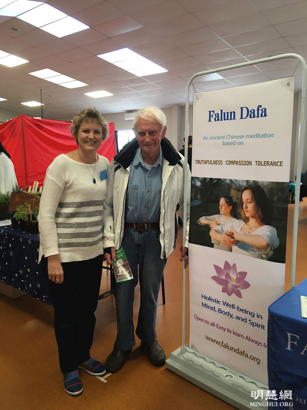 沃特(Watt)夫妇与学员聊了很多。沃特先生说:我相信你说的,法轮大法带有很好的能量,非常正,你们(法轮功学员)非常真诚,你说的话打动我的心。现在的世界与过去已大不同,传统的价值和道德正在被遗弃,人们对于不义的事情,也不再勇敢的发声,这也许正是世界在遭受各种不幸的原因。