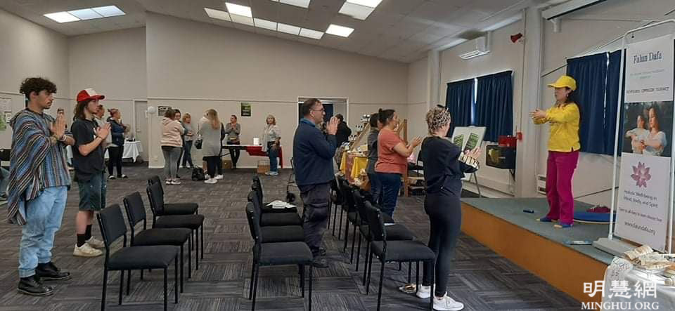 来自英国的伊利(Yeeley)是新西兰知名的声疗师之一,在多地都有自己的活动中心和课程。她已经在网上自学了大部份法轮功炼功动作,但第五套功法还没有学会,这次在健康节看到法轮功学员的展位非常开心,当即跟学员学习第五套功法。