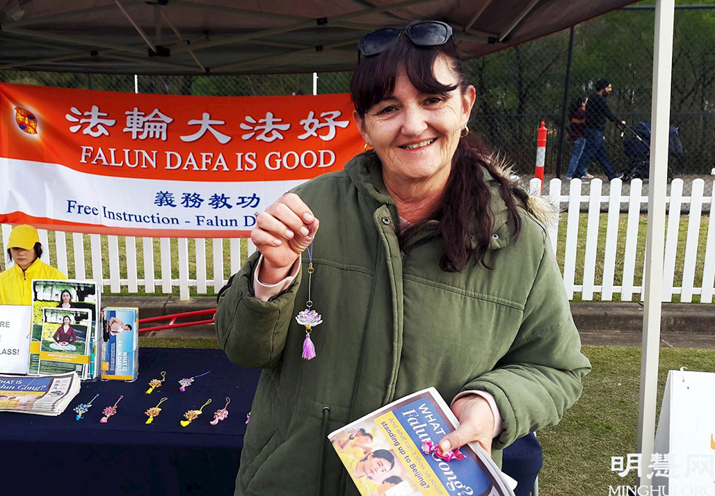 看到法轮功学员的展位,沙琳·麦卡德尔(Sharyn Mcardle)女士召唤身边朋友签名支持法轮功。她表示,自己是几年前从一位亚裔朋友那里听说到法轮功,以及得知中共迫害法轮功的真相,她说:“我希望中国法轮功学员能象我们这里一样,每个人享有人权和信仰自由。我支持法轮功,期望真、善、忍带给世界更多美好。”