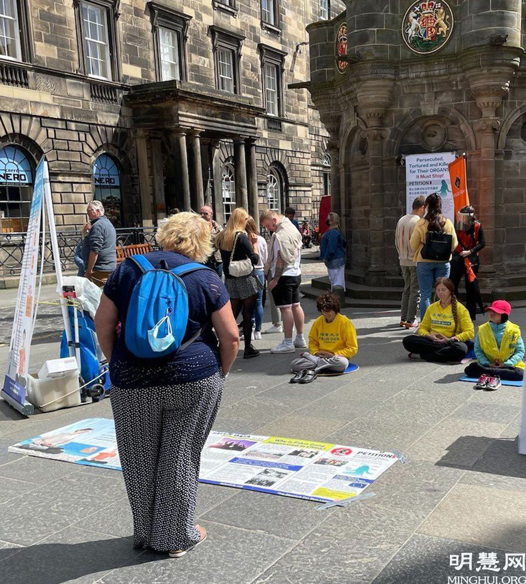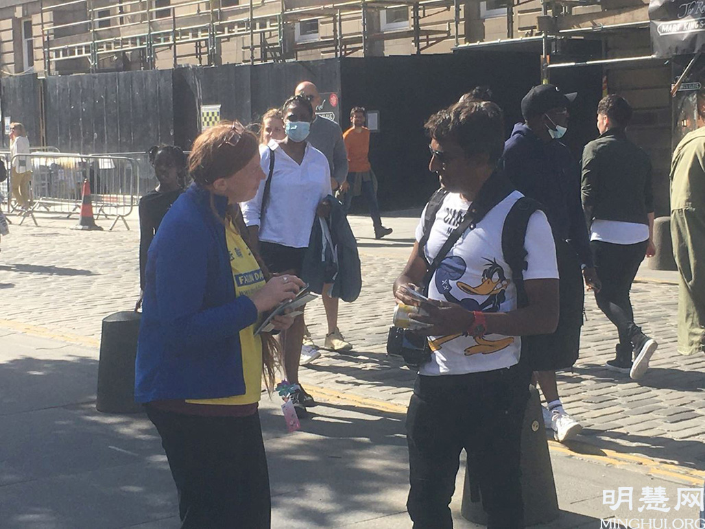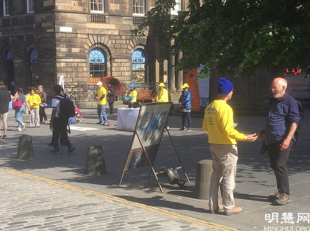 一名到爱丁堡旅游的男士主动来到展位前。他说:“我去过香港,去过中国,那里的一些人和我说了当地情况有多糟糕,包括(中共)迫害法轮功、维吾尔人等等。这些事真令人难以置信。”
