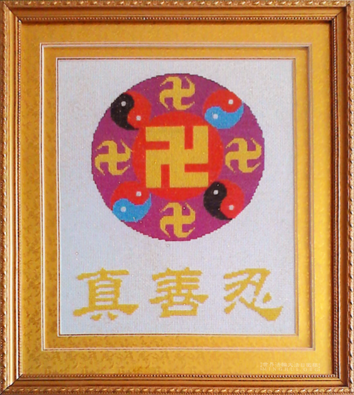 材料:绣线、格子布绣图格数:135W ×163H规格:300mm×350mm装裱后尺寸:450mm×520mm注:成品上的小白点为装裱时撒的金粉。