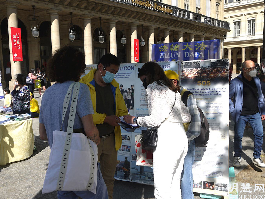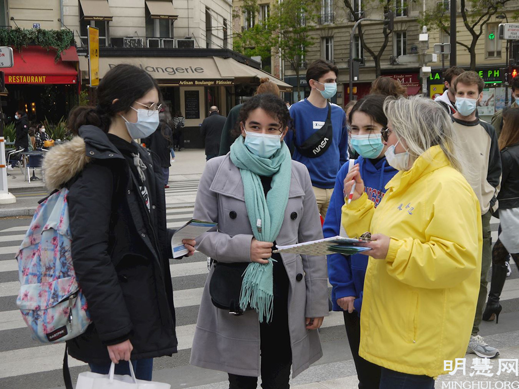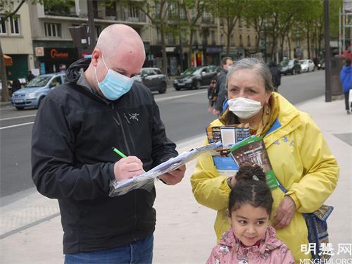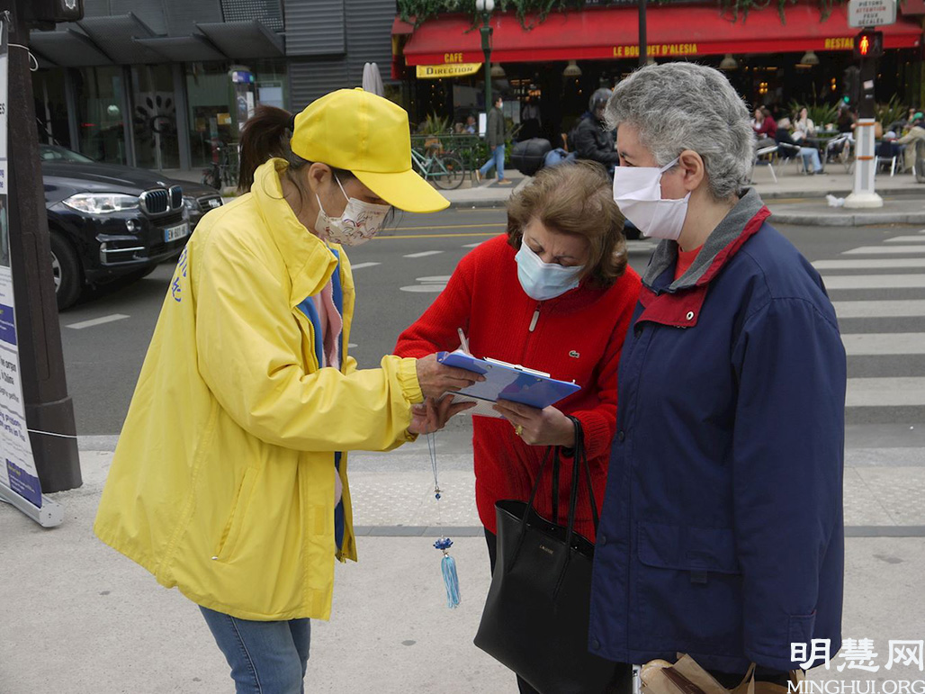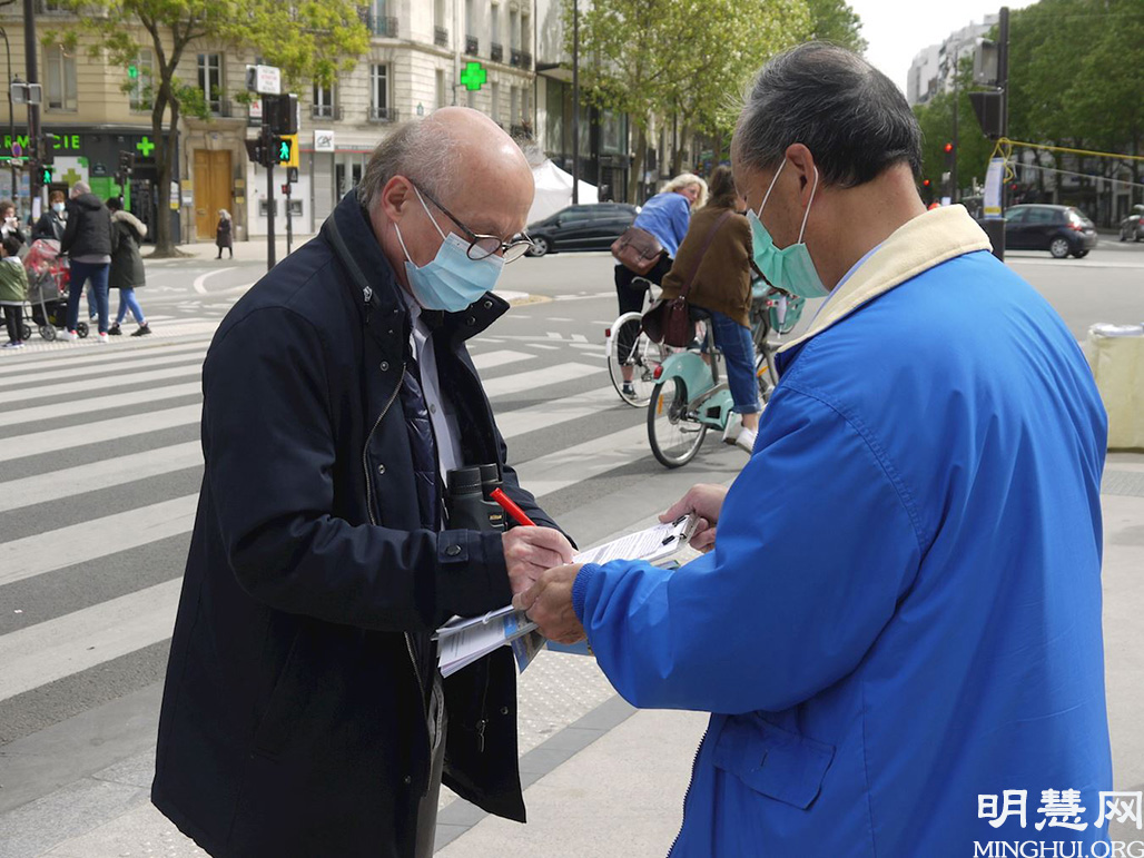 春夏之际,法国已进入逐步解封的第二阶段,街上来往行人很多。人们一走一过之间,在征签表上郑重地签字,表达他们对法轮功反迫害的支持,以及对中共的迫害法轮功的谴责。