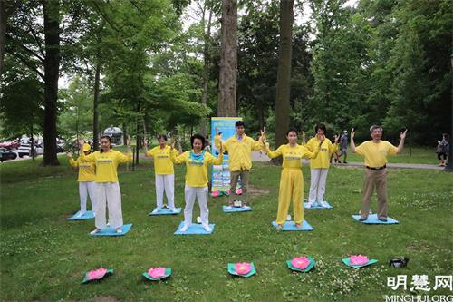 ![]() 图1~2:法轮功学员在尼亚加拉大瀑布(Niagara Falls)炼功点功法演示。 |