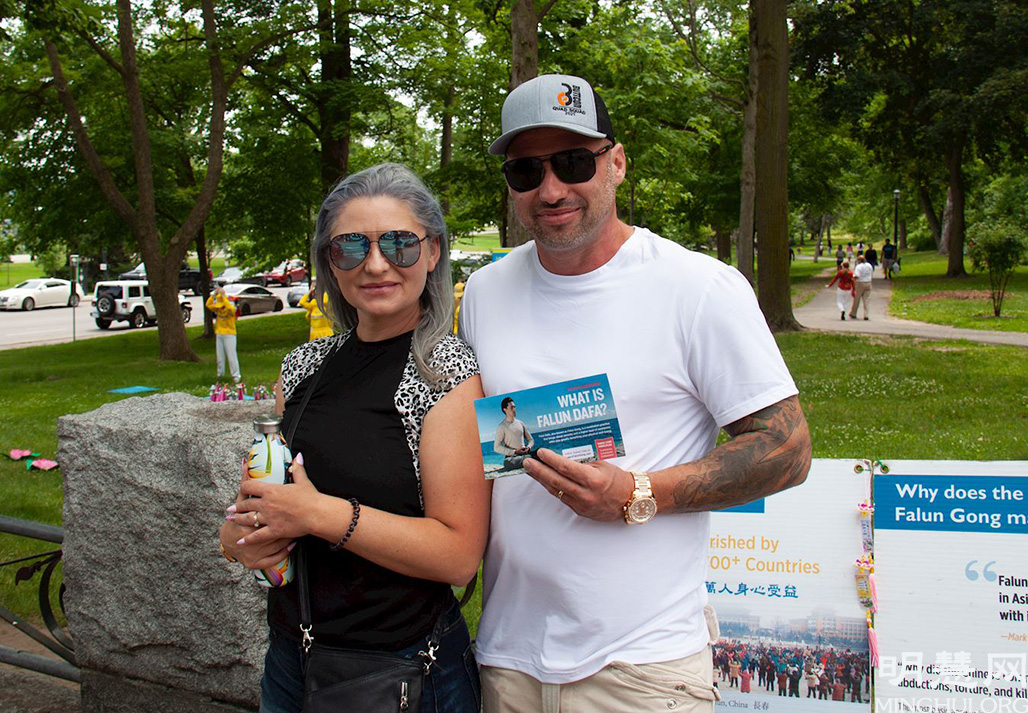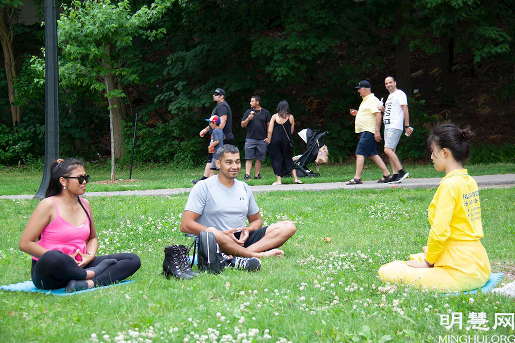 刚刚从印度移民到加拿大的维尔娜(Verna)女士跟先生和弟弟一起到大瀑布观光。她见到炼功点激动的跑过来问学员:“你们是法轮功学员,对吗?我在印度的时候就在炼功点上学过法轮功,但是只学了第一套到第三套,你能告诉我其他几套功法怎么炼吗?”