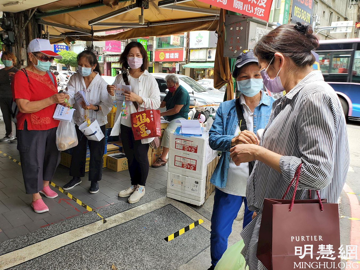 台北市松山区的张静、玉英、素贞等十一位法轮功学员,把握在端午节连放三天假的前一日,分成三组,带上“防疫莲花”与《真善忍特刊》,分别在北市滨江、太平、双连等三个传统市场讲真相,送福音保平安。