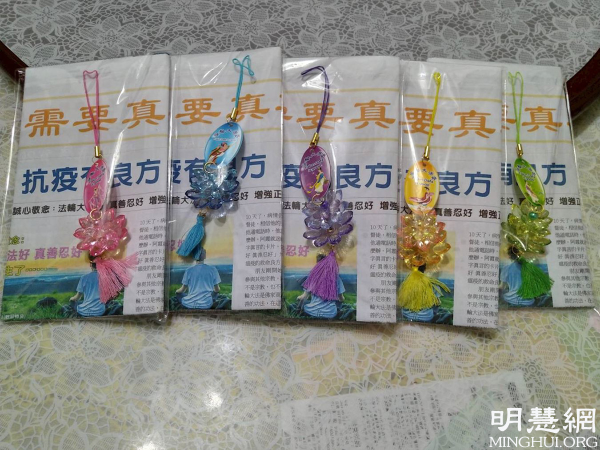 一位五十多岁的母亲带着二十来岁的儿子来到真相摊位,挑选了一份莲花之后,带着不好意思的腼腆对美凤说:“我能不能多要你身上系戴的那个蓝色莲花给我儿子,他脑部开刀,我想让他随身系戴,祈求神佛保平安健康。”美凤当然答应,并且叮嘱时时刻刻诚心默念“法轮大法好 真善忍好”九字真言。一直静静聆听真相的儿子这时开口道谢,并且表示回去之后,好好阅读《真善忍特刊》和真相资料,也会到美凤所介绍的炼功点去,多了解法轮大法。