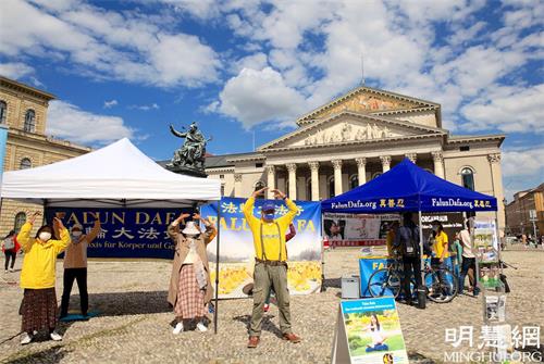 二零二一年六月十九日,法轮功学员在慕尼黑东火车站奥雷昂斯广场(Orleansplatz)举办信息日活动。不少人跟法轮功学员交谈并签名,也有人当场学炼法轮功功法。